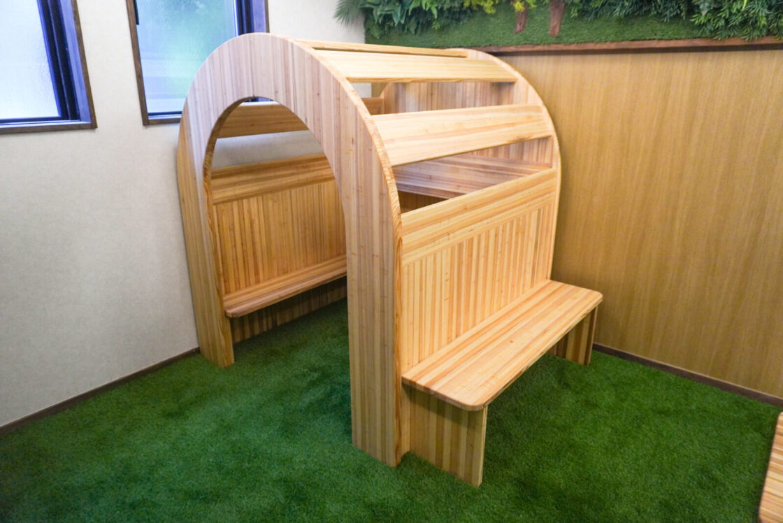 「絵本ドーム」の足元にも同じく人工芝が施されているため、ゆったりと腰を下ろして絵本の世界に没入できる、落ち着いた雰囲気に仕上がっています。
