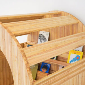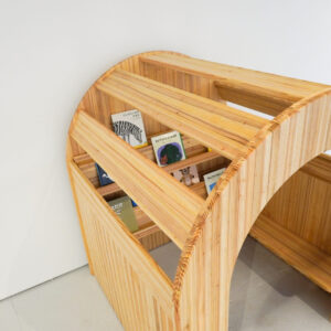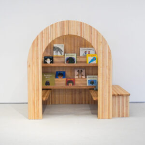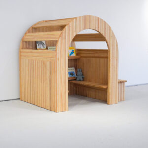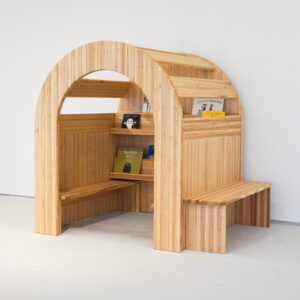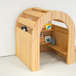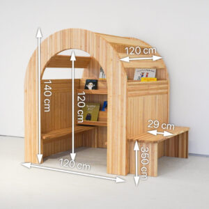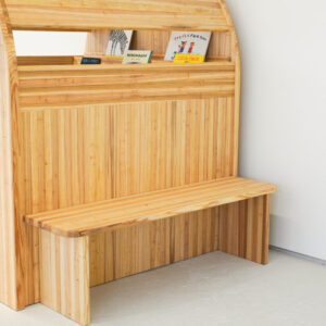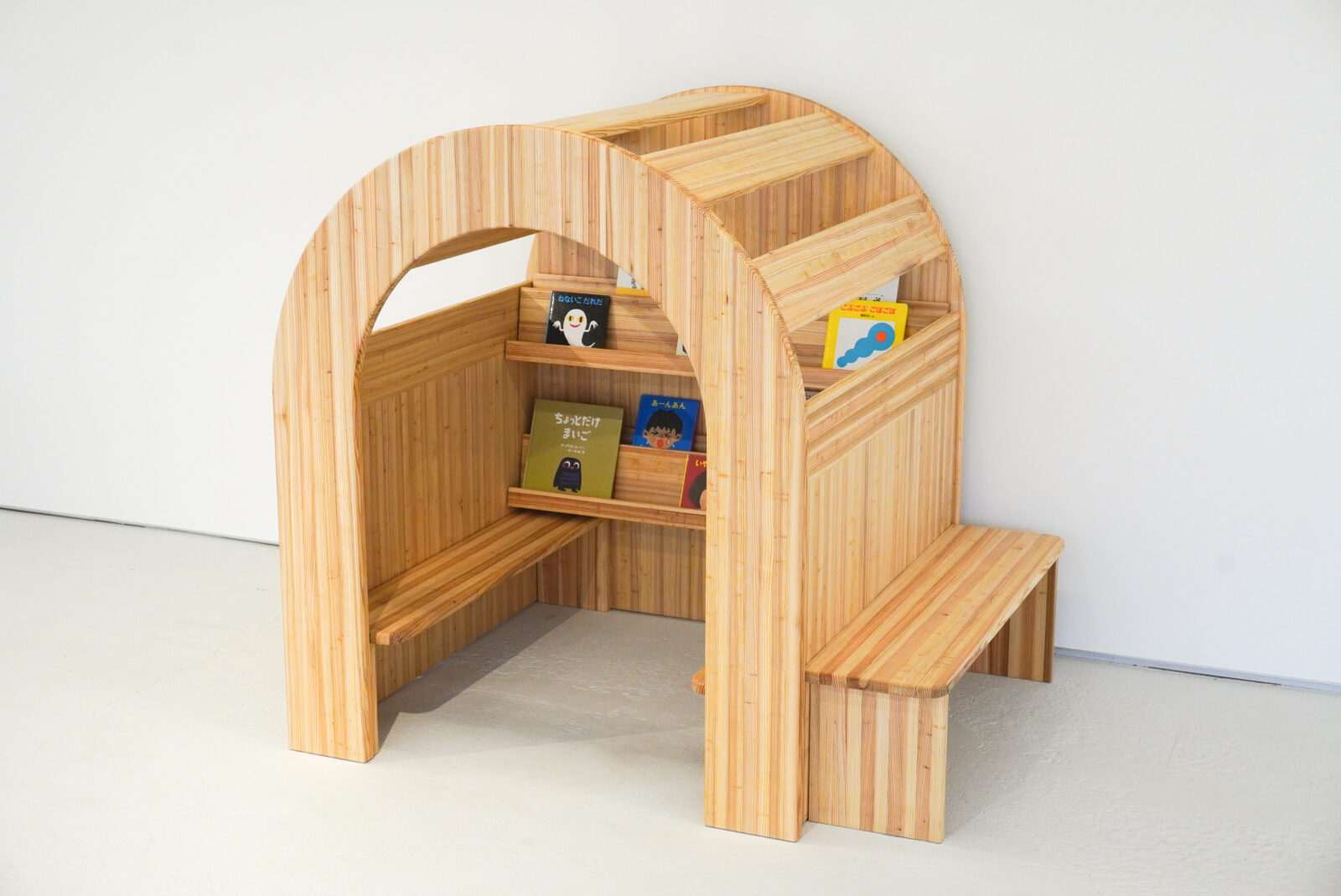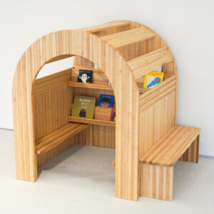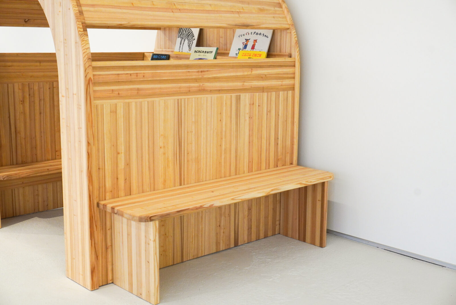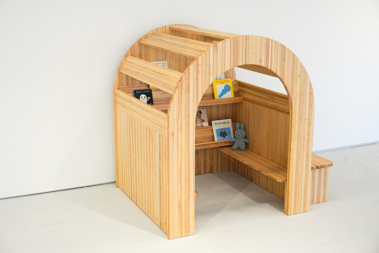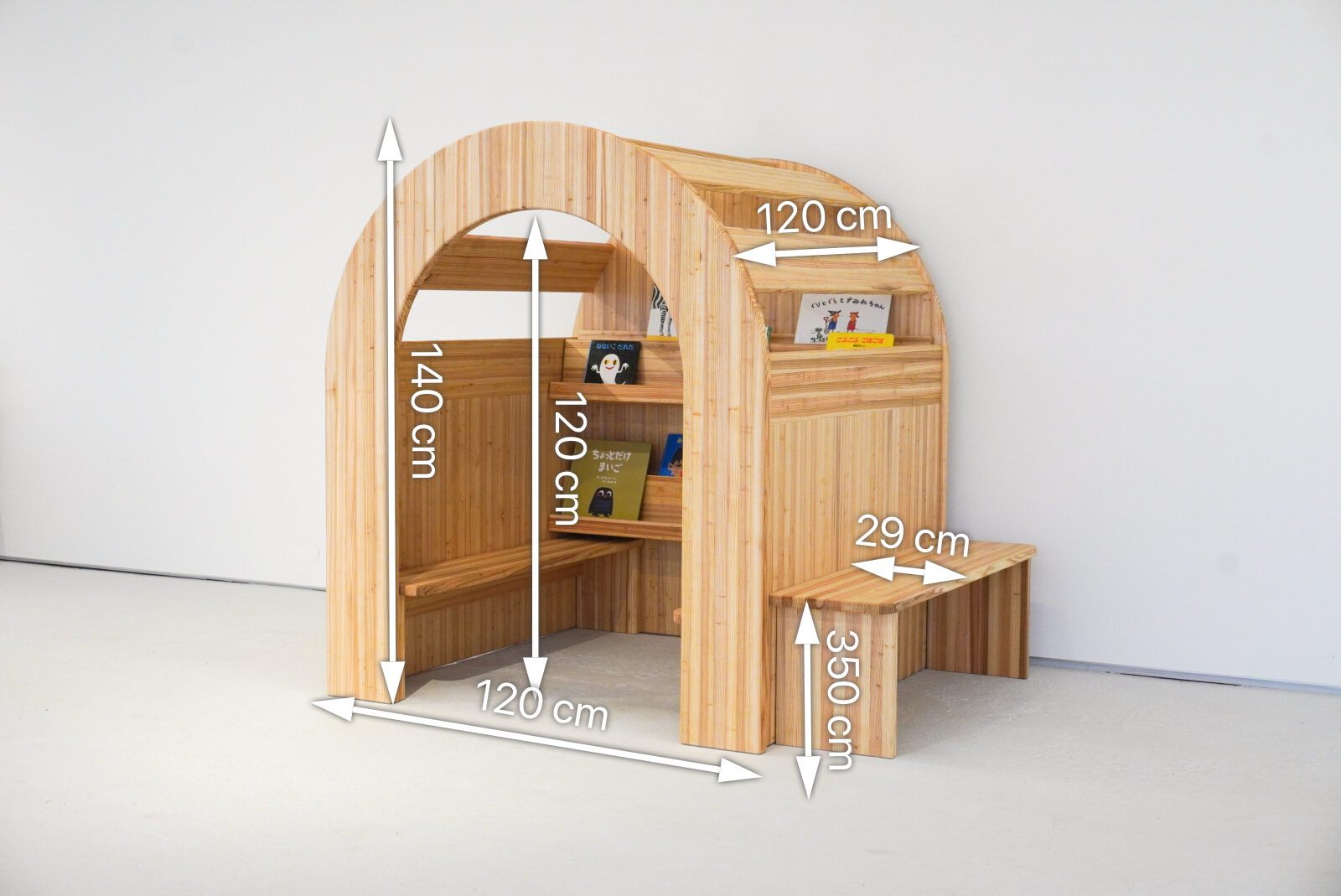 「絵本ドーム」は、温かみのある木のアーチが印象的な、トンネル型の読書スペースです。座り心地の良いベンチと本棚が一体になった省スペース設計で、外部の音や視線を適度に遮りながら、読書に集中しやすい環境をつくります。