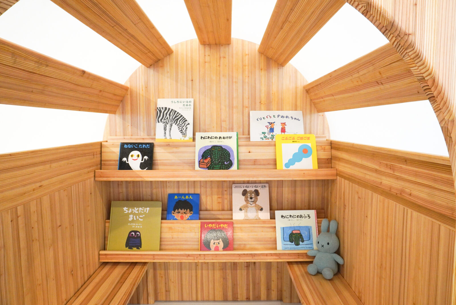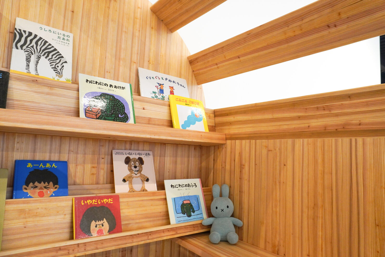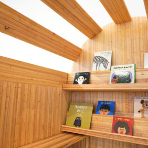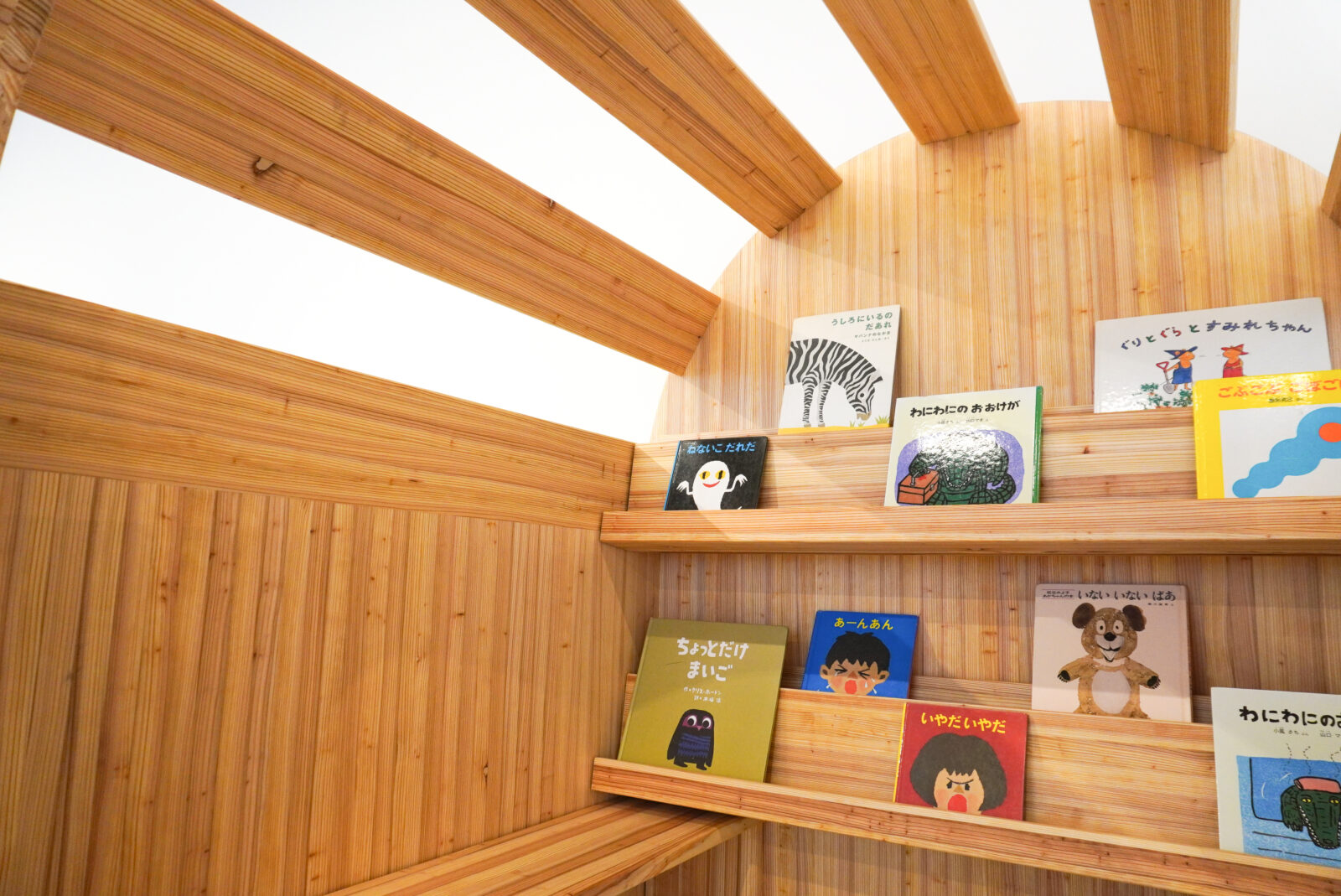 子どもたちが自然に集まって、絵本や木とふれあうきっかけになるような空間をイメージしてデザインしています。